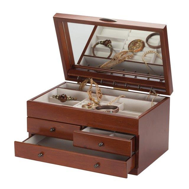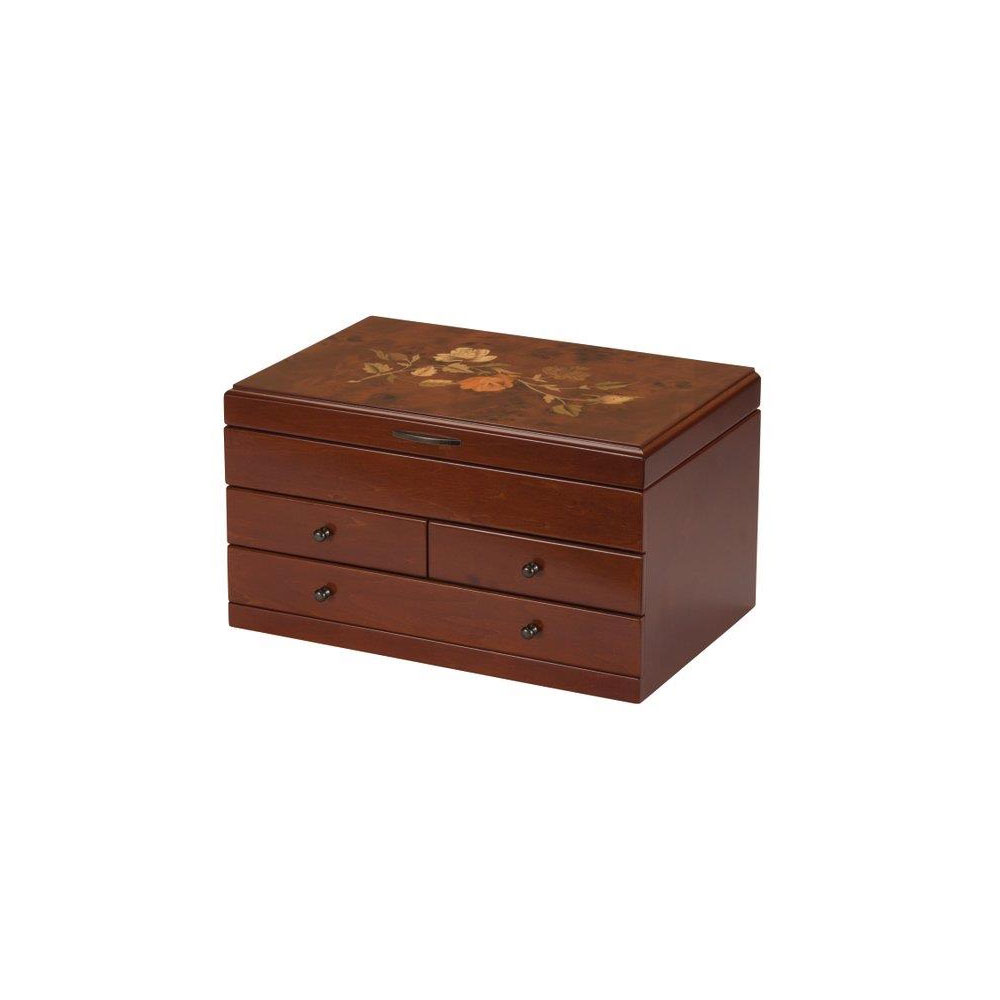 Mahogany finish floral jewellery case with burl & floral detailing on lid. Top section has ring rolls, compartments, full mirror and necklace fall with 7 hooks.