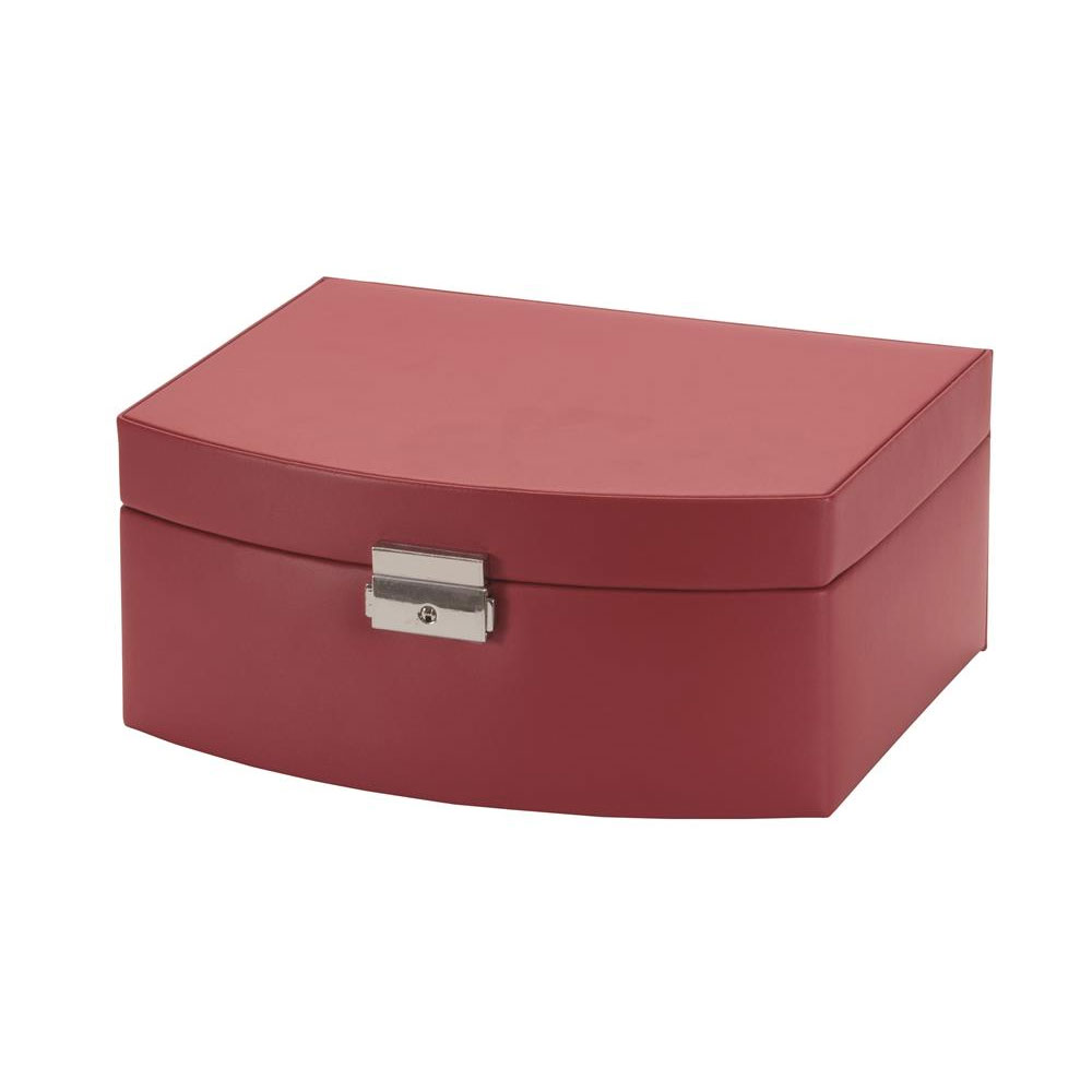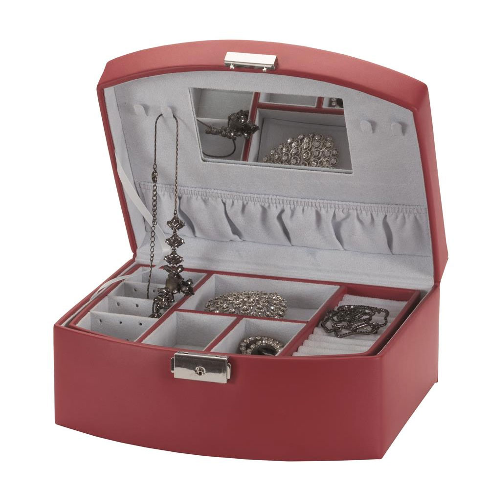 Red bonded leather jewellery case with soft grey interior, curved front and lift out tray. The tray has ring roll, earring holders and compartments, there are 4 necklace hooks and elasticated pocket and mirror in the lid, with a large compartment below the tray. The box is lockable.