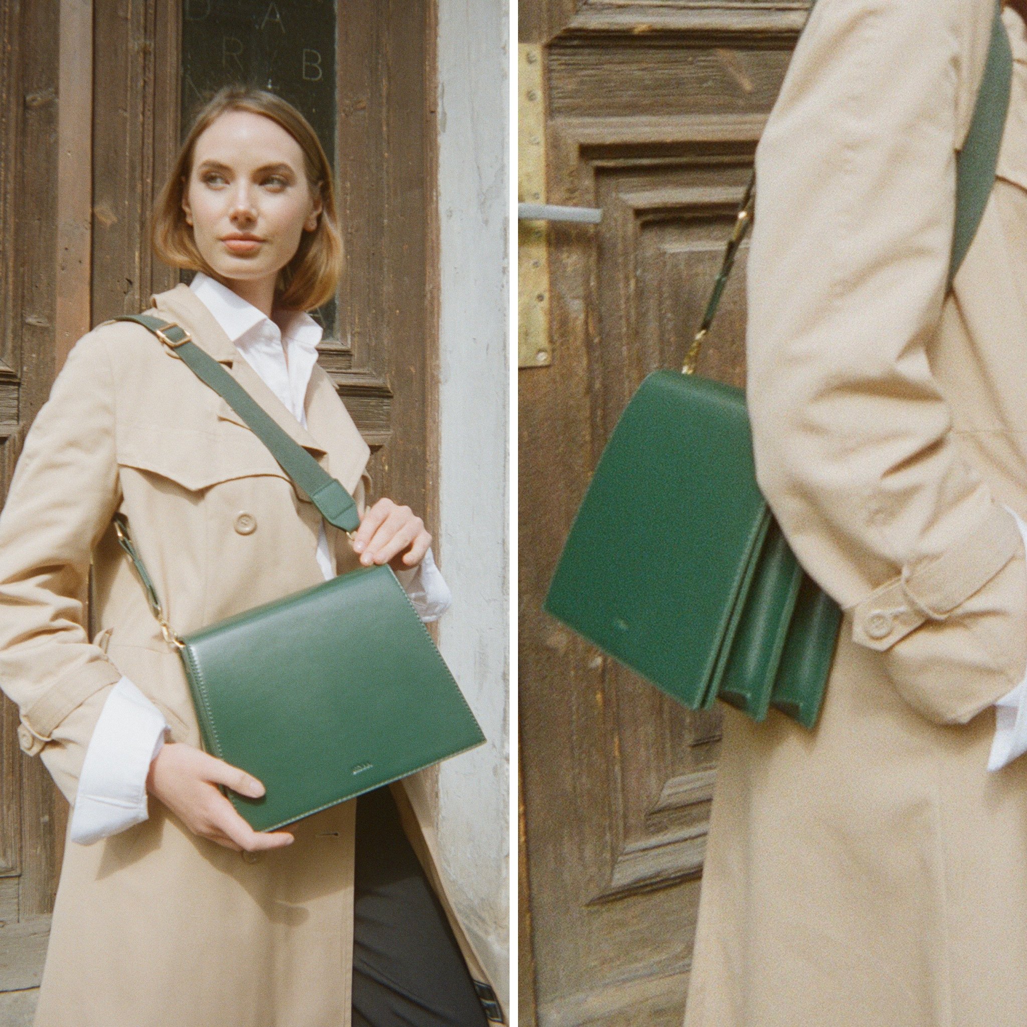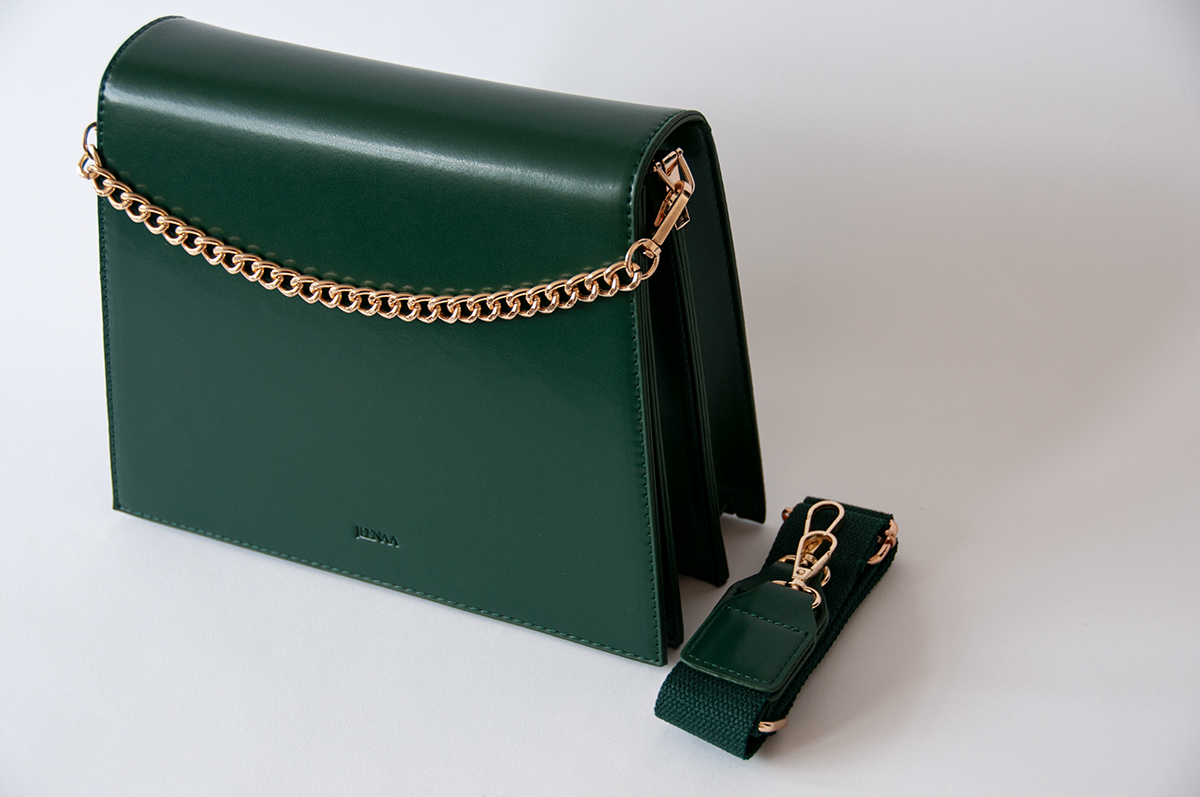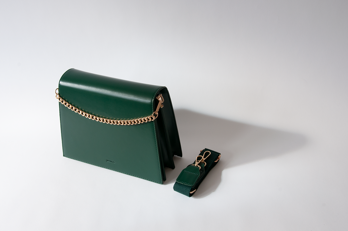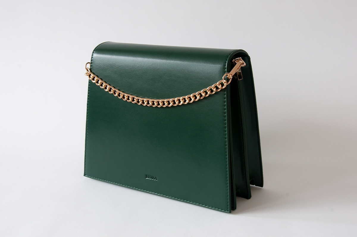 Make a rich, elegant statement with Jeele Emerald Bag. Perfect for commutes, formal meetings, and running errands. Choice of wearing it as cross-body, over-the-shoulder using its soft, wide cotton strap, or can be held in hand using its rich, gold chain, short strap or even styled as a clutch.