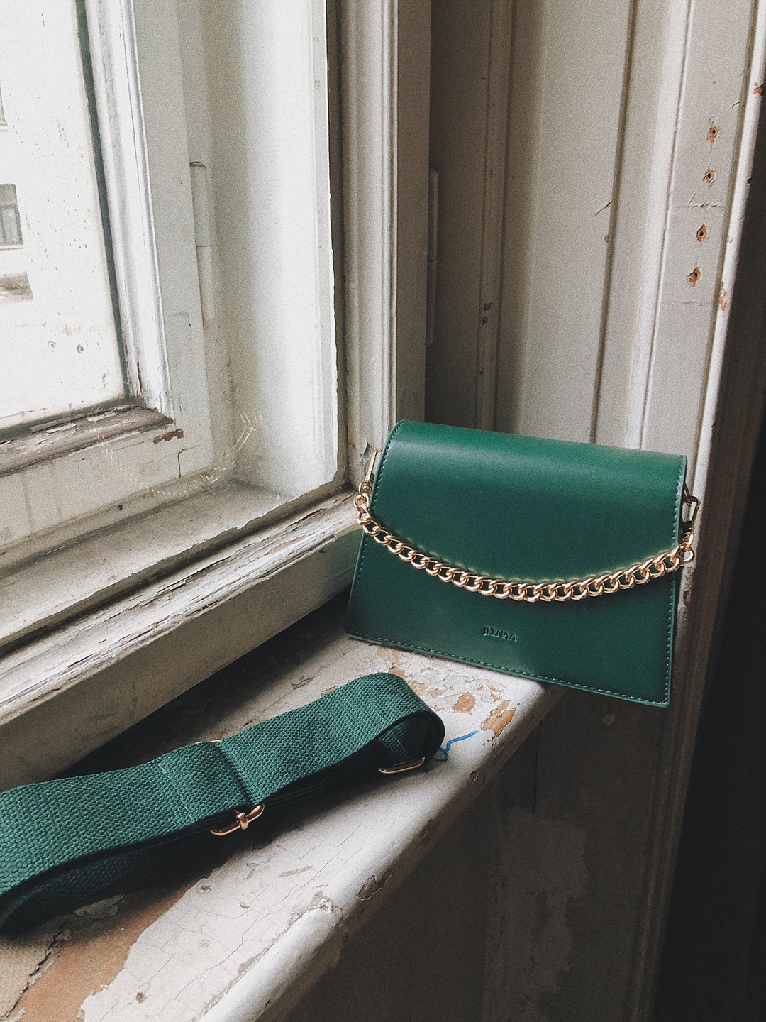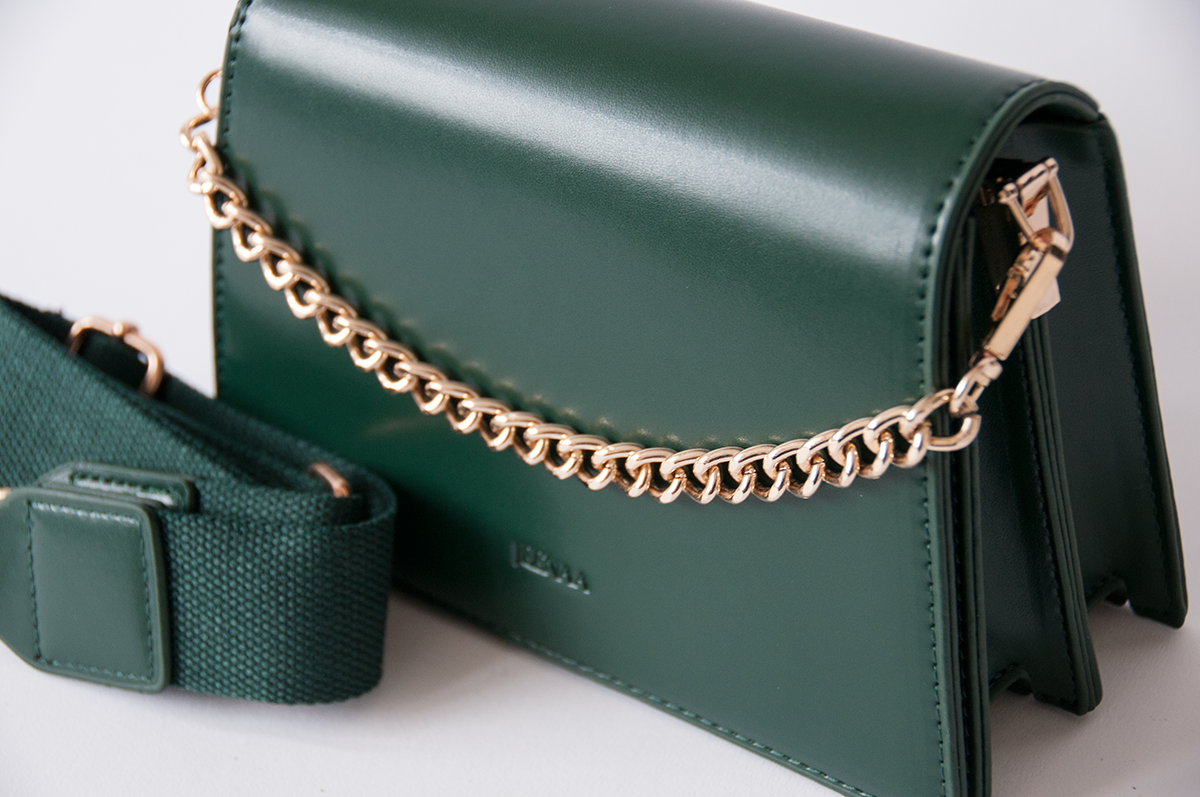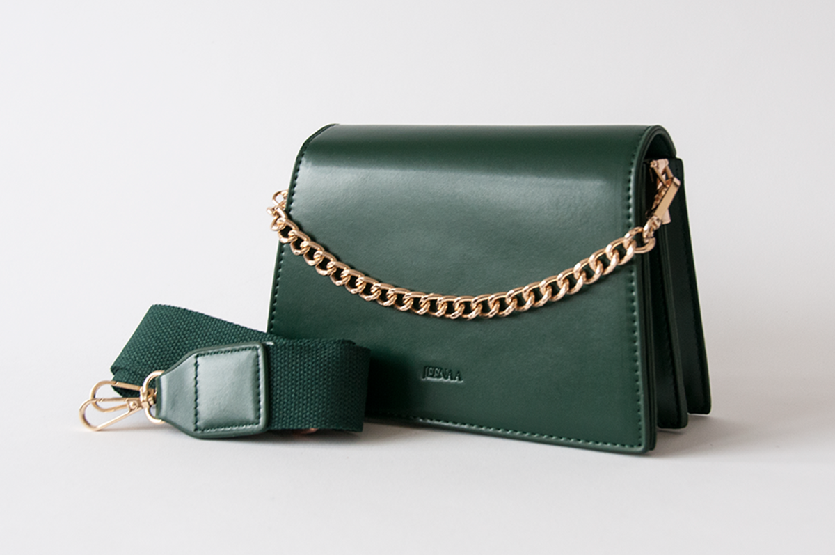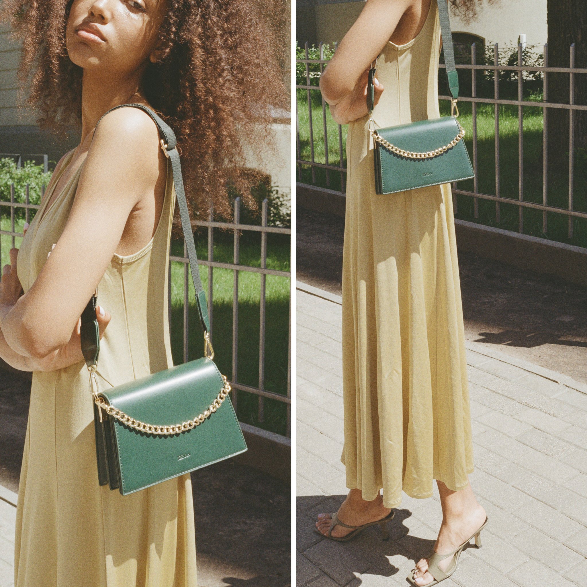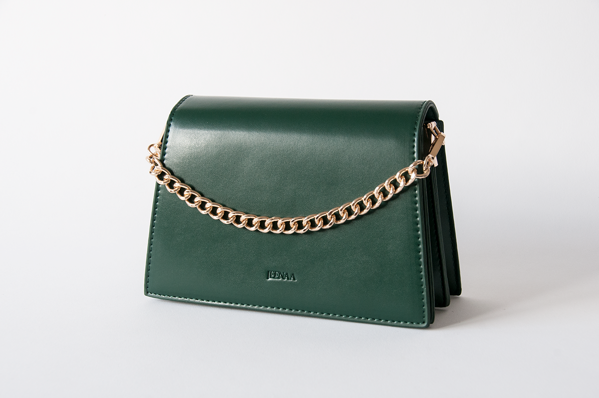 Make a rich, elegant statement with Jee Emerald Bag. Ideal for running errands and can be styled for evening wear too. Choice of wearing it as cross-body, over-the-shoulder using its soft, wide cotton strap, or can be held in hand using its rich, gold chain, or styled as a clutch.