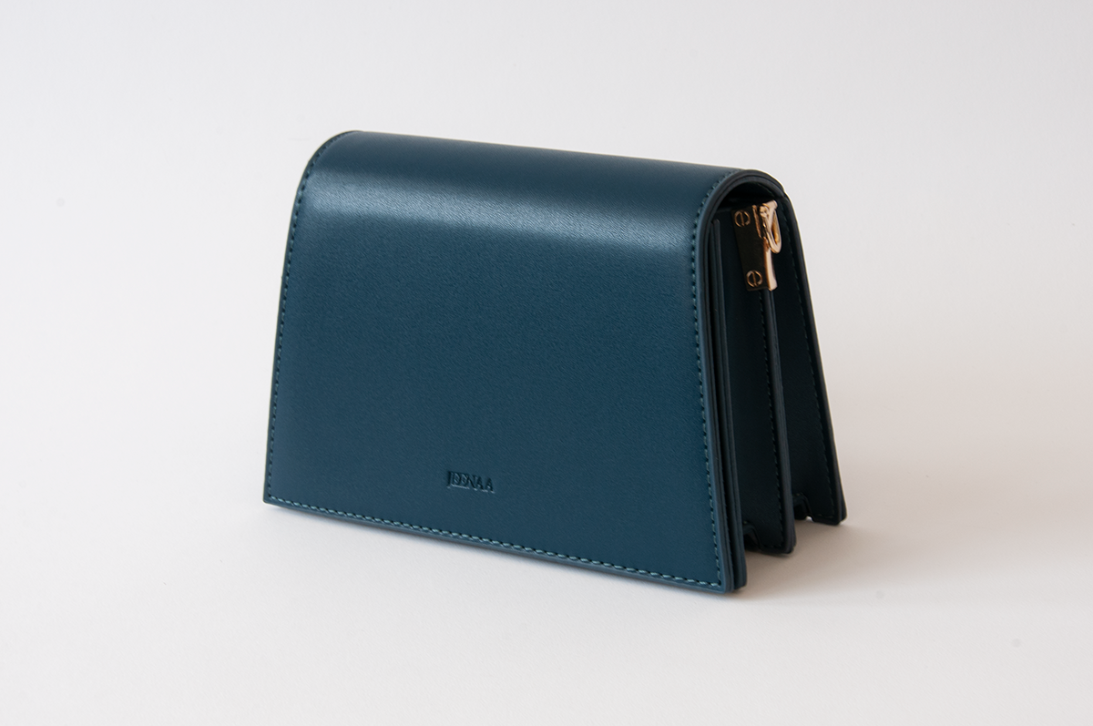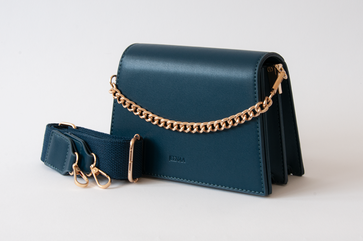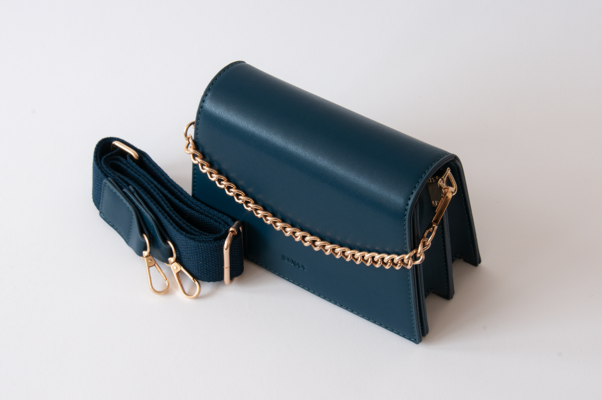 Ideal for running errands. Small size with subtly curvy top edge, two compartments. Detachable gold chain and wide cotton strap. Versatile ways of wearing – clutch, shoulder or across-body. Designed in England.