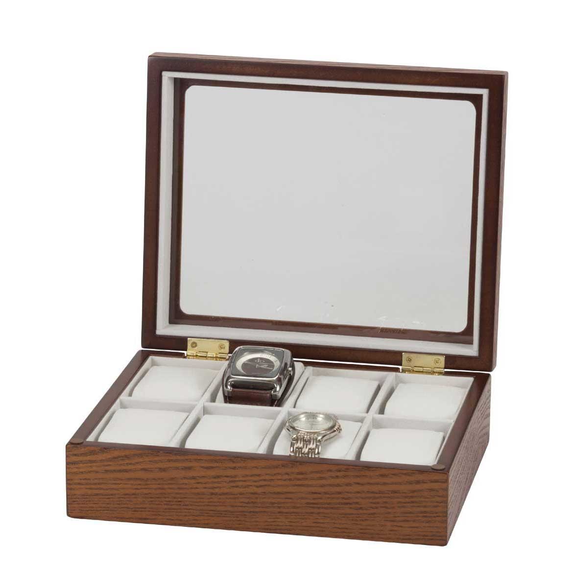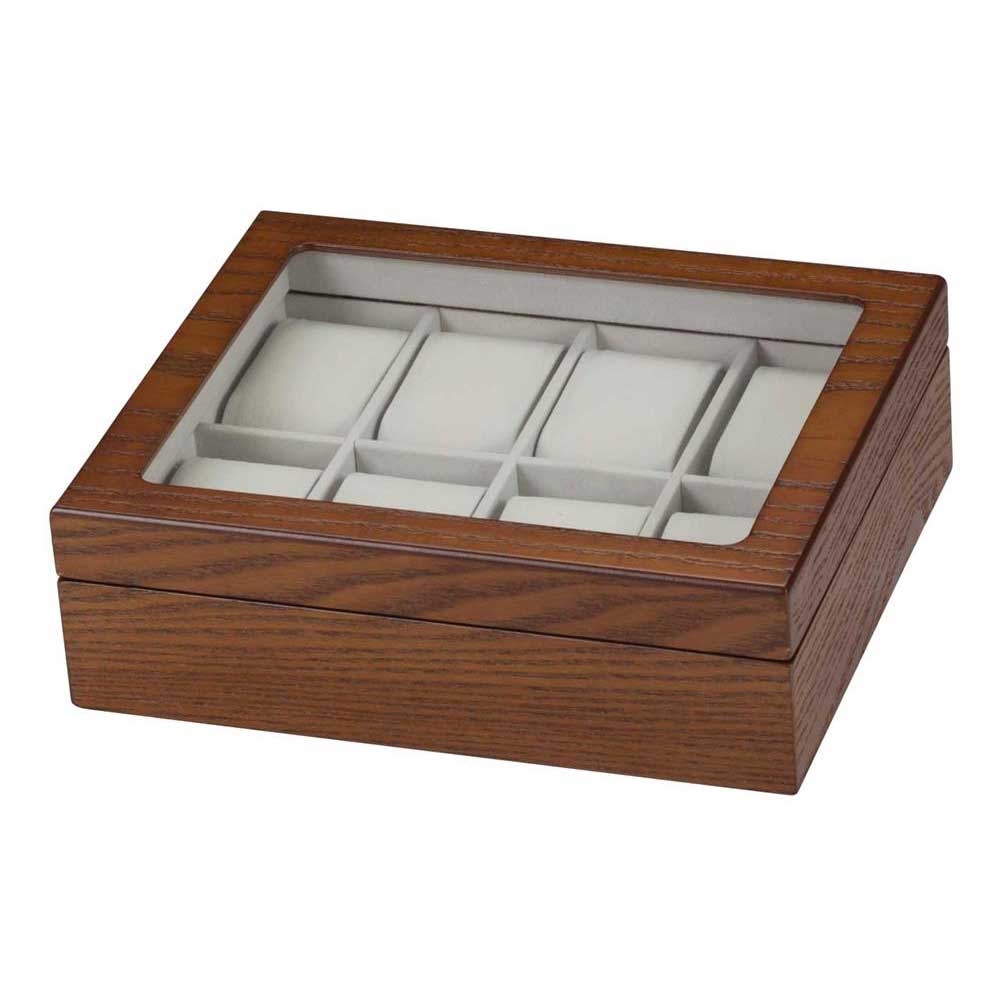Dark beech finish 8 watch box with glass top and beige suede effect lining.Product Dimensions 30 x 20 x 8cms