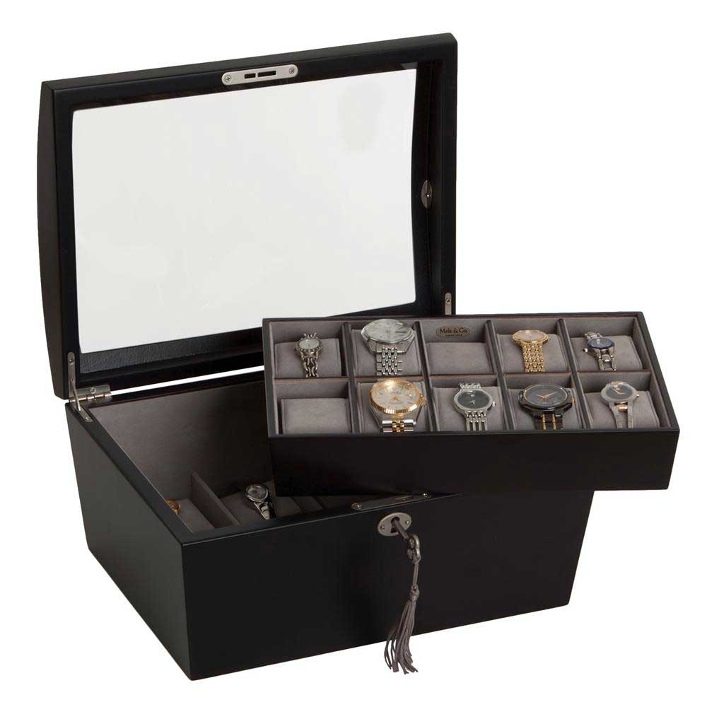 Java finish locking watch boxDomed glass topLift out tray features ten sections with padded watch cushionsBottom compartment offers four sections with padded watch cushionsplus one lengthwise open sectionBrushed aluminium tone lock and tasselled keyHand lined in sumptuous grey sueded fabricDimensions: 30 x 22 x 14cms