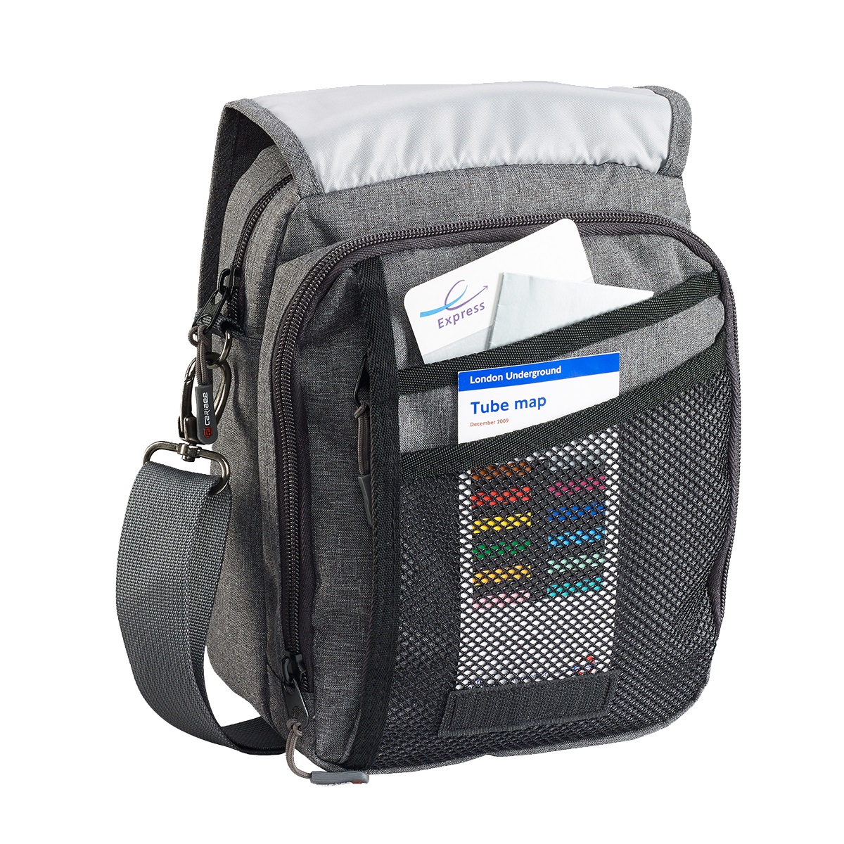Travel pouch with multiple compartments. There is a front organiser panel and behind this is a large compartment with multiple pockets, which are both protected by the Velcro flap. There is a top accessible main compartment plus a zipped pocket on the back for phone storage. The bag also comes with an adjustable shoulder strap.