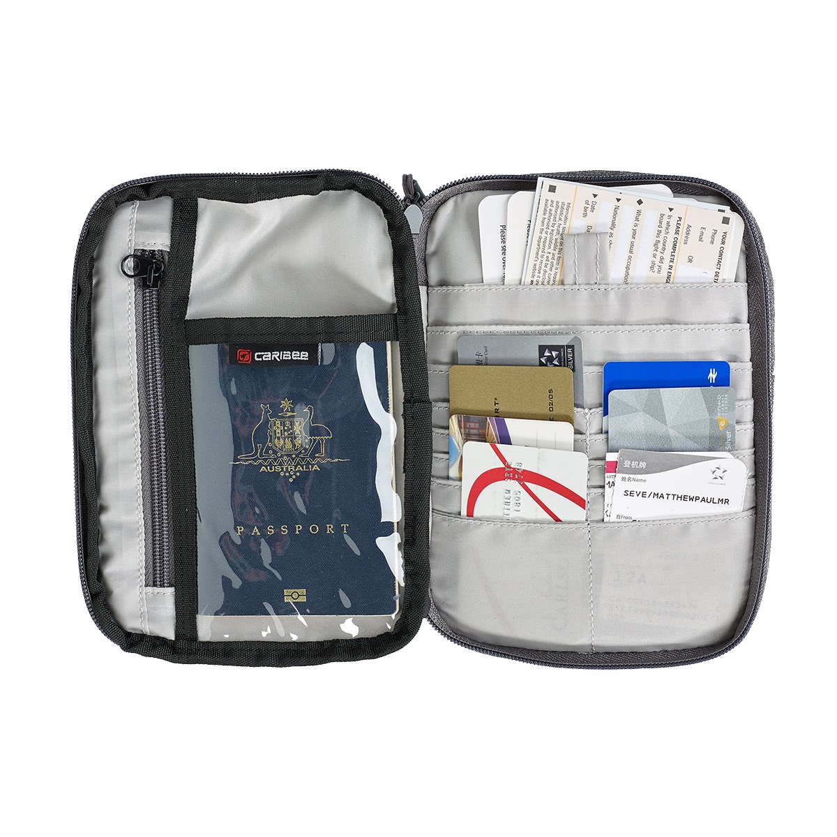 RFID (Radio Frequency Identification) is the use of radio waves to read and capture information stored on a tagged object such as credit cards and passports. The Travel Wallet features an RFID protection pocket to prevent this, allowing you to travel safely and confidently.