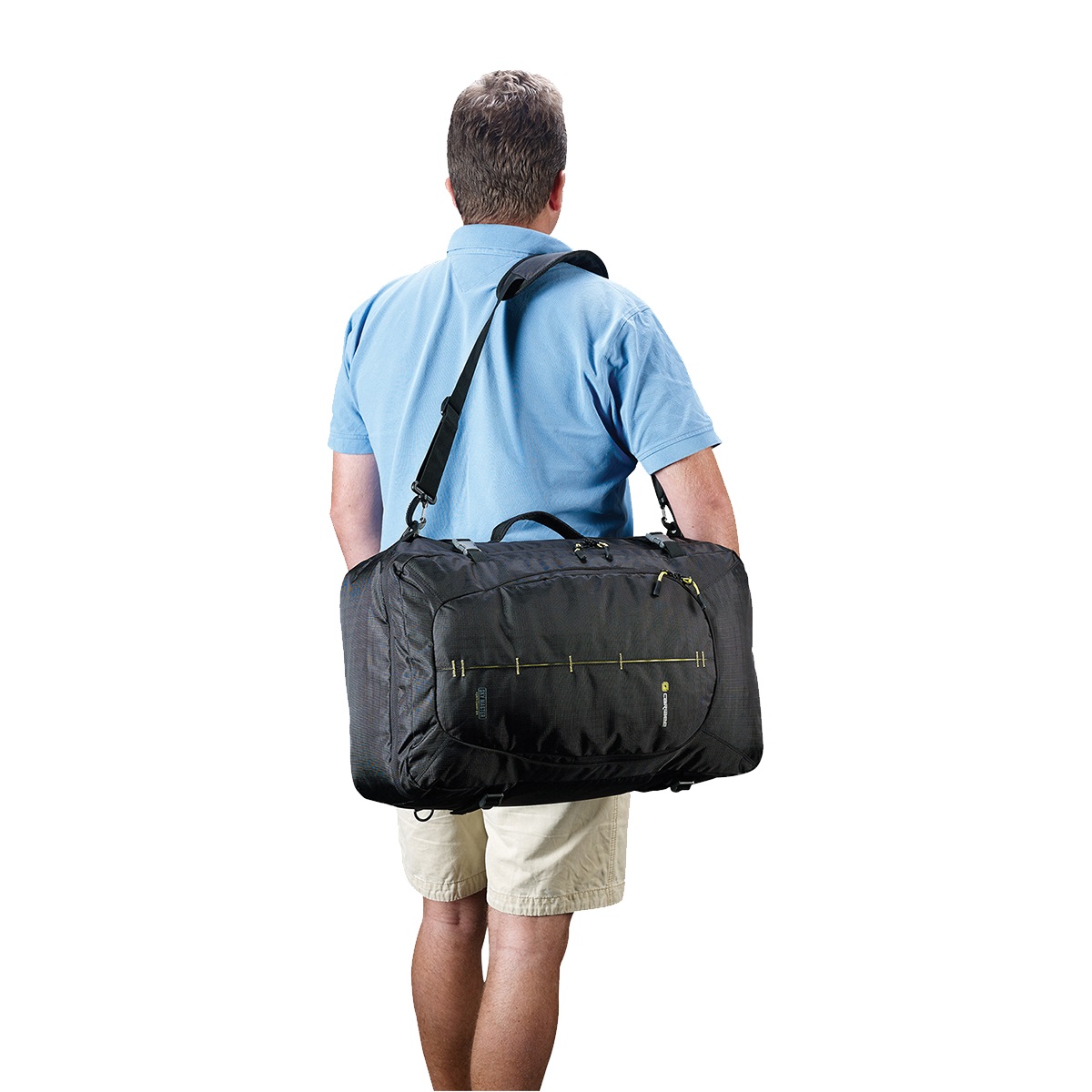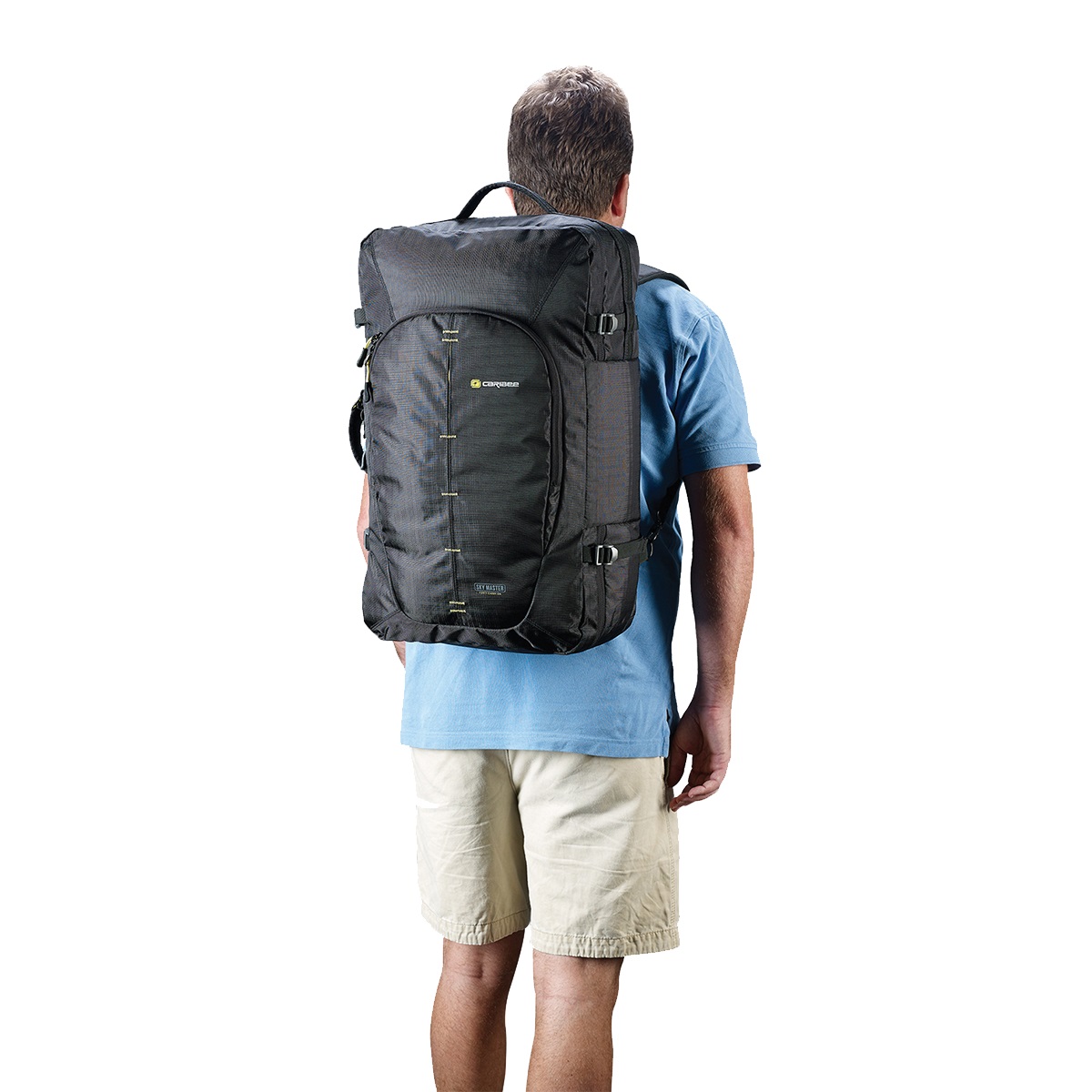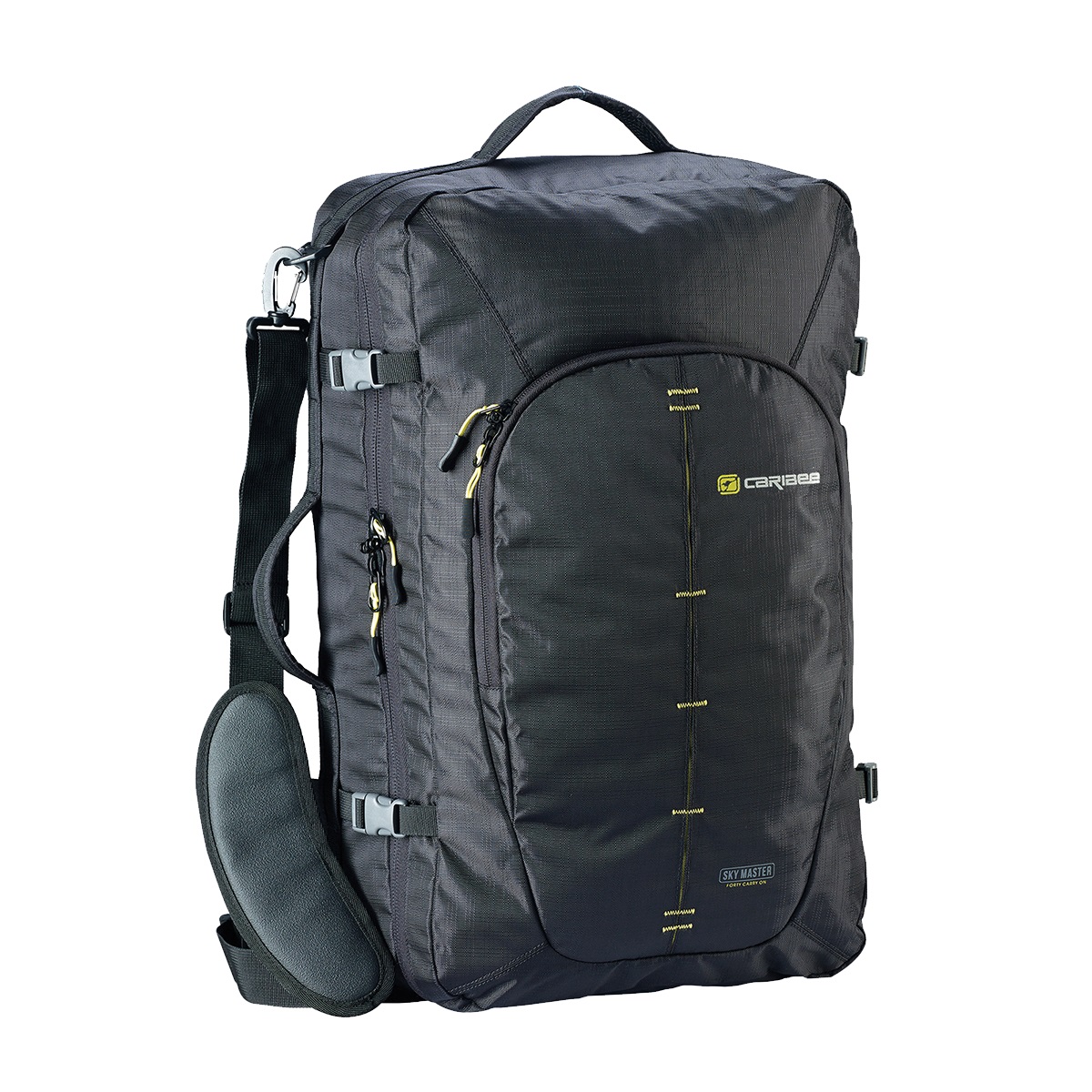 The Sky Master 40 Carry-On is a light weight carry-on weighing just 1.2kg designed with short distance work trips and weekends away in mind. The bag features a concealable backpack and detachable shoulder strap, allowing multiple carrying styles as a backpack or off one shoulder. There is a heavy-duty zip that splits the bag open around the mid-section dividing the main compartment in two. Each compartments content is secured by a zipped mesh panel, and the bottom larger compartment features QR compression straps.