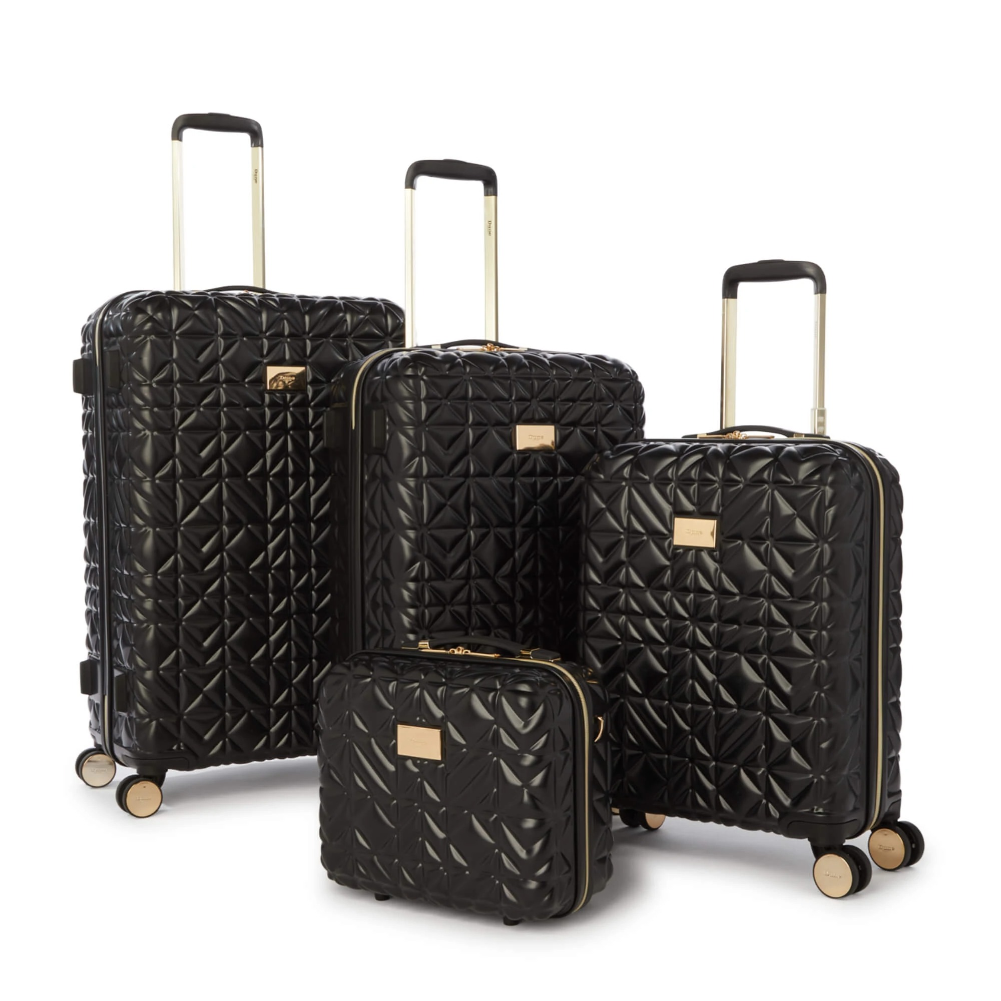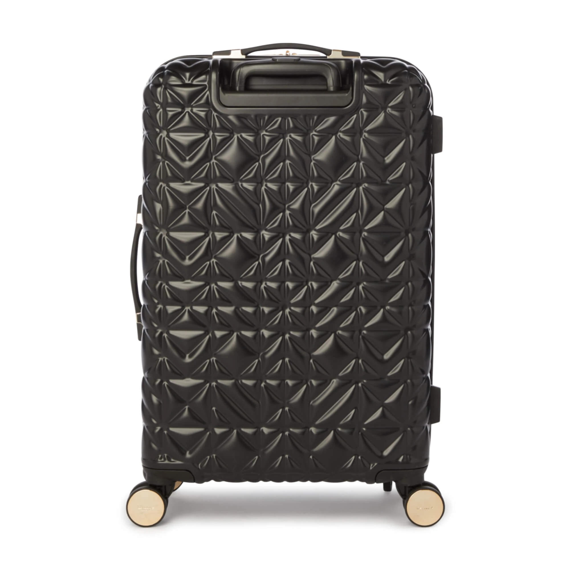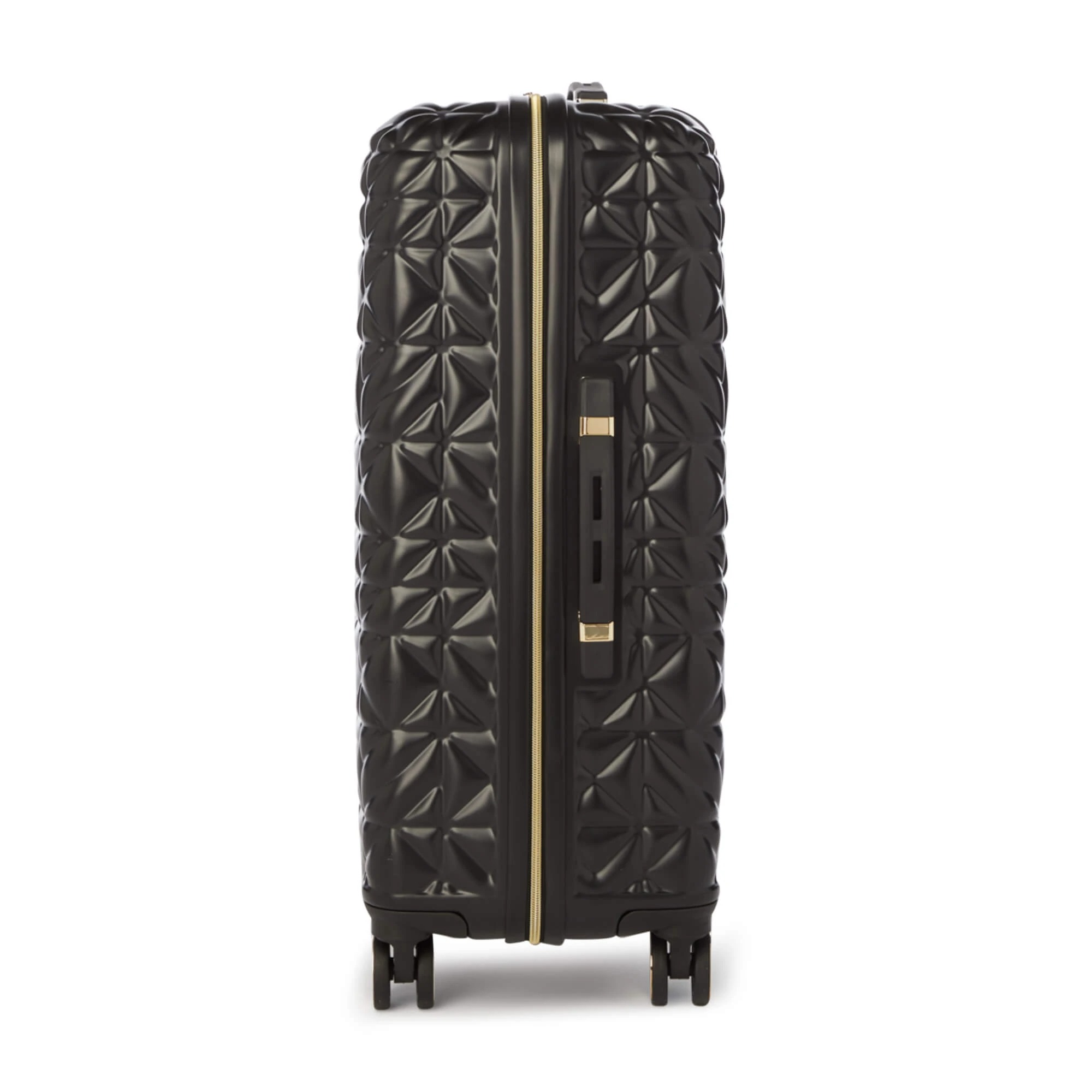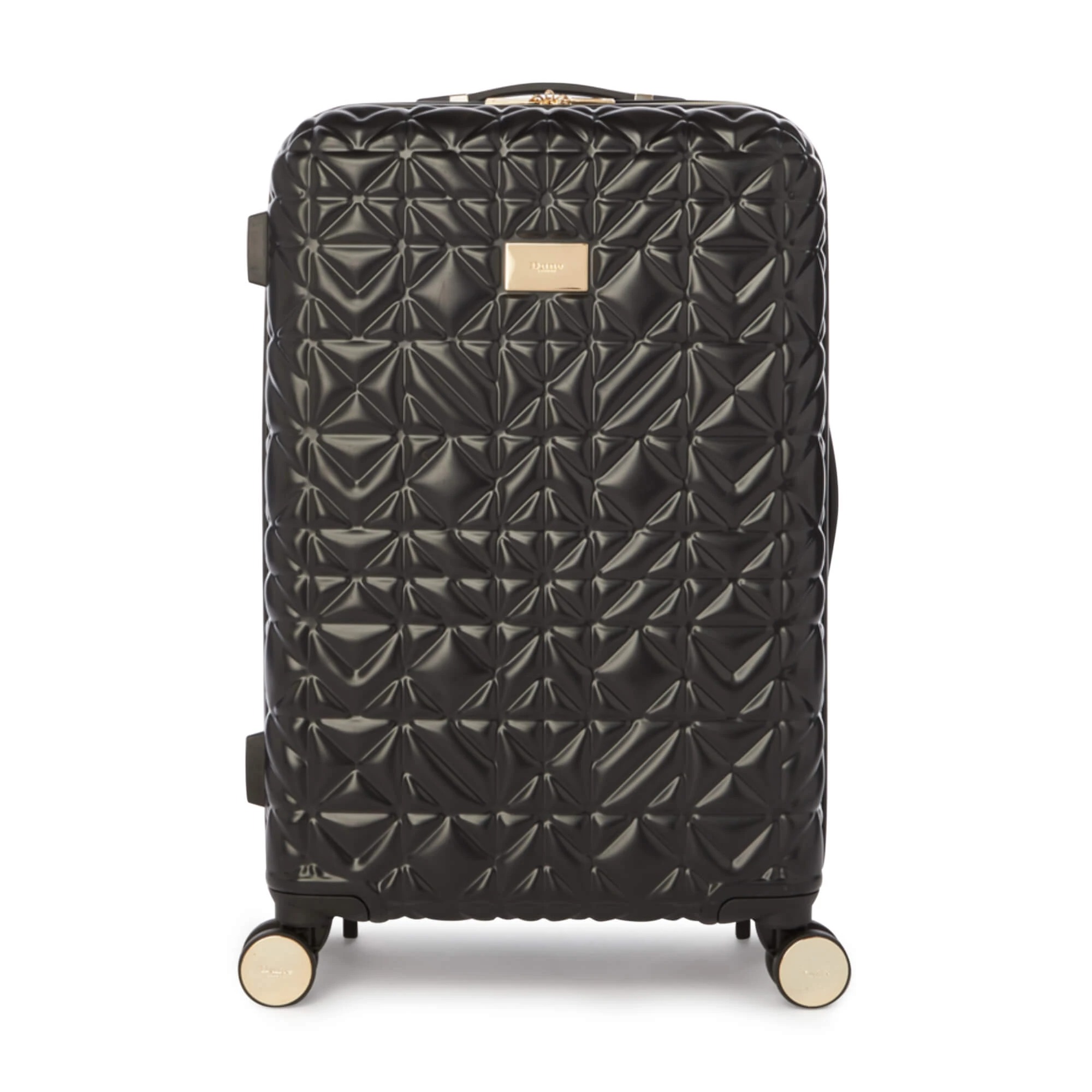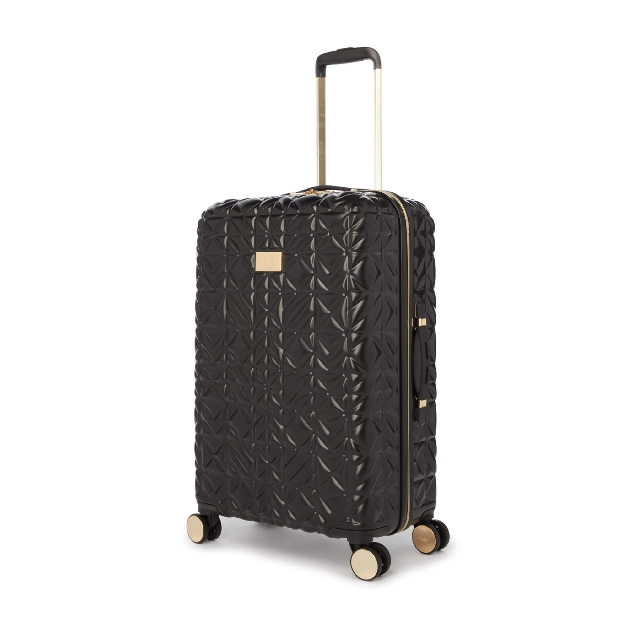 The Ovangelina collection is made from a superlight and strong material which is impact resistant. Four smooth double wheels with 360° rotation and Dune London logo hubcaps. Internal pockets and straps for organised packing. A lightweight trolley system with signature gold finish. TSA Padlock included. A 2-year manufacturer's warranty.Dimensions: 67cm x 44cm x 27cmWeight: 3.6kgCapacity: 72 litres