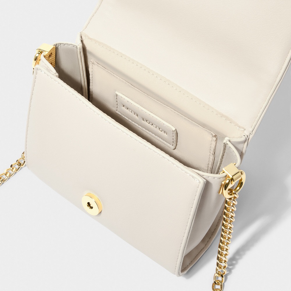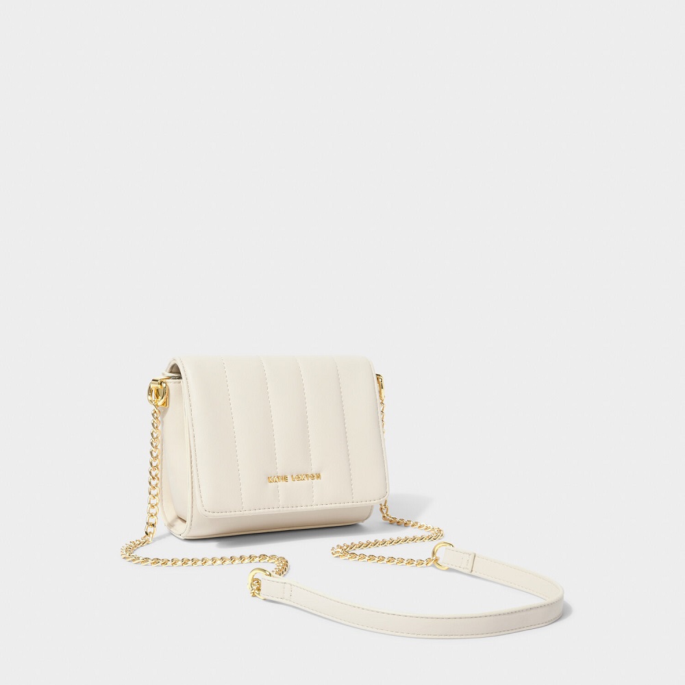 Katie Loxton Kendra Quilted Crossbody Bag in OysterKatie Loxton's quilted styles are back by popular demand! The Kendra Quilted Crossbody Bag in Oyster is made from luxe vegan leather material and features a trendy quilted design. Cleverly made with an internal slip pocket and a chain shoulder strap that adjusts to the perfect length, so you can carry it everywhere you go – from work to nights out and everything in between. Pair it with the matching clutch for a stylish look that’s sure to turn heads.