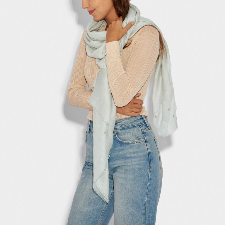 Katie Loxton Small Heart Scarf in Duck Egg, Blue Silver FoilAdd a pop of colour to your outfit of the day with our Small Heart Scarf. Designed to keep you warm all year round with a soft woven material and an eye-catching pattern that is sure to turn heads for all the right reasons. With endless ways to style, whether it's worn around the neck, as a chic shawl, or tied around one of our gorgeous handbags - layering never looked so good!Size: H: 184cm W: 86cm D: 0.2cm