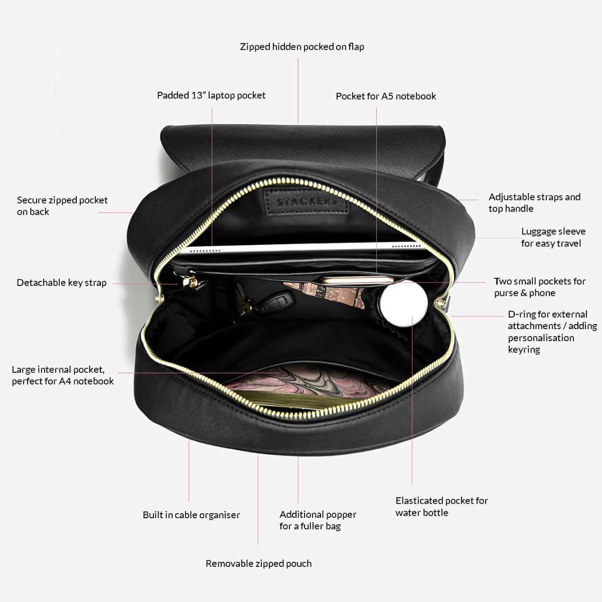 Bring some order to everyday. There will be no excuses not to stay super organised with this ladies backpack.With a faux leather exterior, our backpack includes a large internal padded sleeve for your laptop (up to 13 inch), multiple pockets, a space for your drinks bottle and a large compartment for all your daily essentials. There are additional zipped pockets to the back and the inside of the lid as well a large zipped pocket with elasticated compartments for smaller accessories. To complete this bag there is an integrated pocket with a small removable zipped coin purse on the front. Life's journey, simplified... Be the most organised version of yourself with the Stackers bag collectionKey features:• Space for a laptop (up to 13 inch)• Adjustable straps• Coin purse included• Multiple internal and external pockets• Elasticated internal drinks pocket• Fits over suitcase handles• Protective studs on base• Front pocket built-in cable tidy• Add a personalised keyring• Available in Blush, Taupe and Black