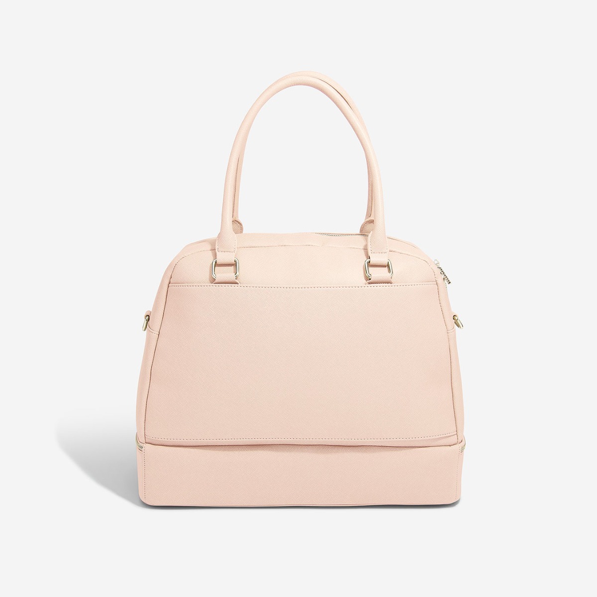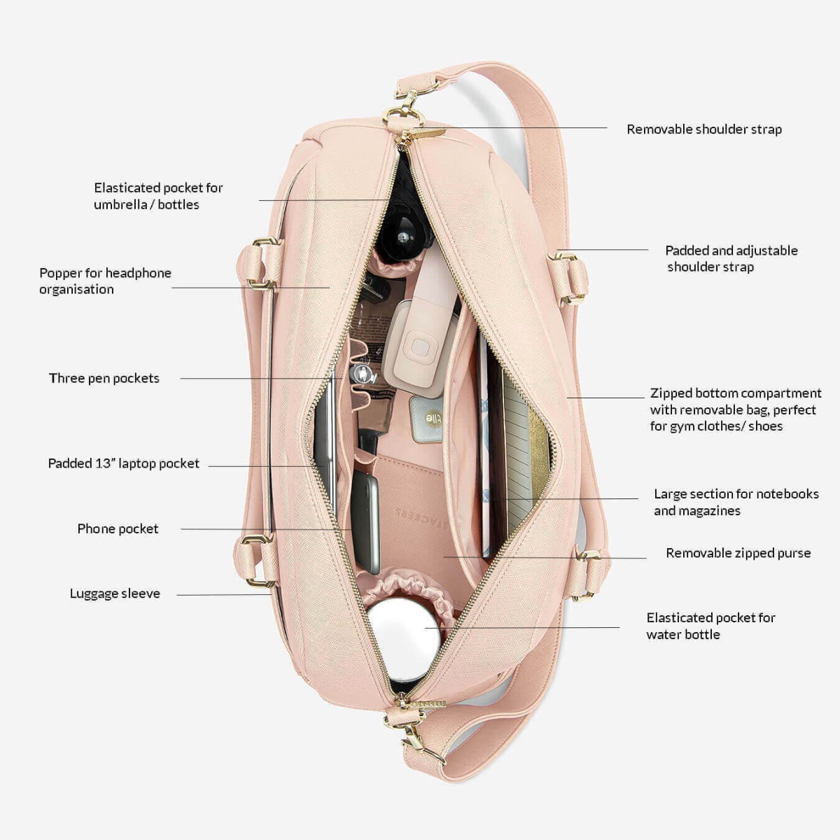 A bag that matches your lifestyle. Add a bit of effortless organisation to your day. This handbag really does have a place for everything, and more, no more losing your phone in a bottomless pit!With a faux leather exterior, it features multiple internal compartments including a padded quilted laptop sleeve, two elasticated side pockets, a space for your phone as well as a zipped pocket. There is also a large zipped compartment to the base that features a removal drawstring pouch, perfect for gym trainers! Perhaps the most stylish workout bag; from work to the gym, from the night to the weekend.The bag for modern living.Key features:• Space for a laptop (up to 13 inch)• Zipped base compartment featuring a removable drawstring pouch – pouch is machine washable• Removable shoulder strap • Multiple internal and external pockets• Fits over suitcase handles• 2 elasticated internal drinks pocket• Protective studs on base• Detachable pouch, great as a purse• Popper to keep headphones tangle free Zipped base compartment is 9cm high• Available in Blush, Taupe and Black