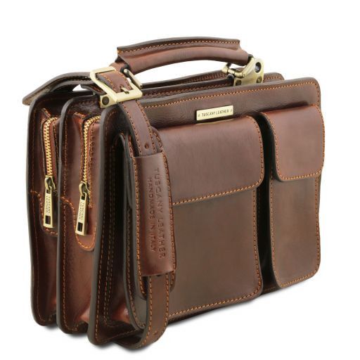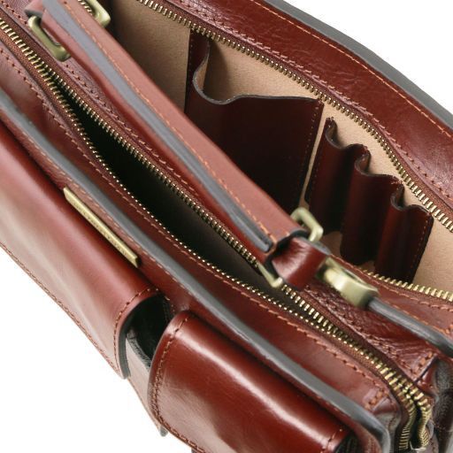 Main features- Detachable and adjustable leather shoulder strap- Full grain hand stained vegetable tanned leather- Rigid structure- 2 compartments