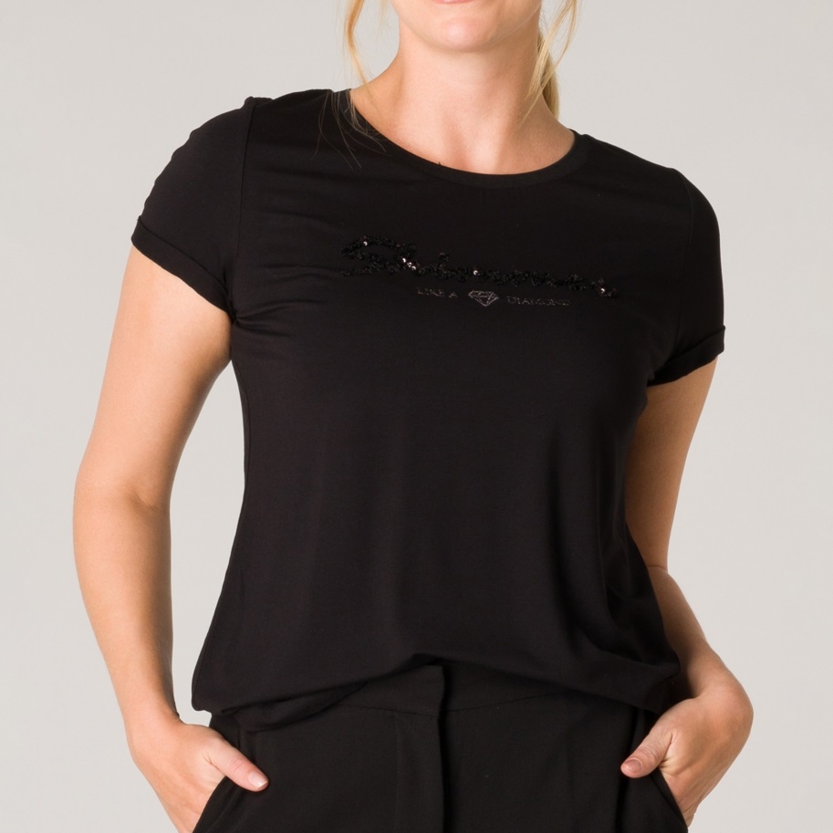 Cheméne Jersey Shirt by YESTT-shirt with a shiny print on the front, the top of the back is partly lace. The Cheméne from YEST has a Regular Fit and is made of 96% Viscose and 4% Elastane. This Jersey Shirt is available in Black