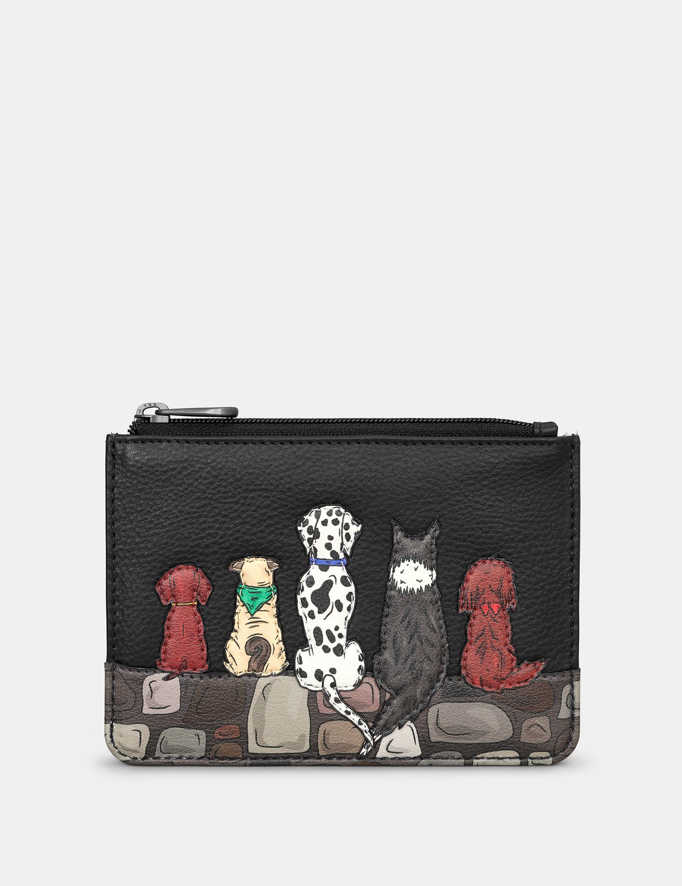 Keep it simple with this slimline leather purse for women that has been finished in a grainy black leather which accentuates the vibrant appliques on the front. This curious rabble of canine companions feature our favourite four-legged friends such as the Daschund, Pug, Poodle, Chihuahua, Dalmation, Border Collie and Spaniel. Here they sit on top of an old stone wall which adds further detail to this women’s leather purse. The delicately drawn dogs on the front of this women’s leather zip top purse stir those feelings we have for our favourite four-legged friends and remind why we love to have them by our side. This purse has a zip top fastening and a very handy credit card slot on the outer and credit cards will also fit in the zip section. RFID protection is also included as standard for your peace of mind.