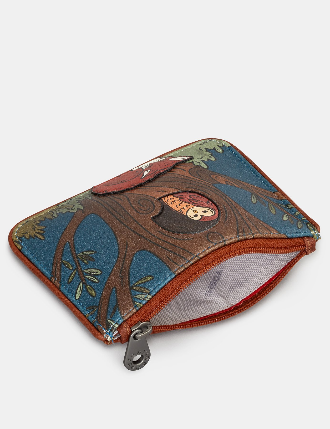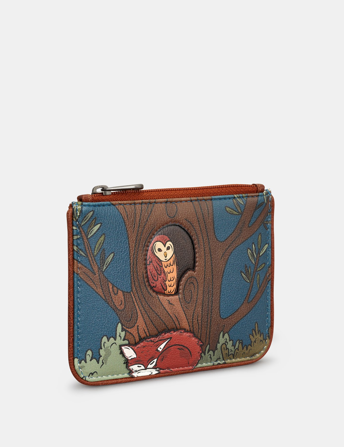 A fox and an owl settle down in the deep dark woods on the front of this zip top leather purse. This women's purse style has RFID Protection and is a lovely compact design which fits nicely into any pocket or bag with space for coins, cards, and bank notes etc.